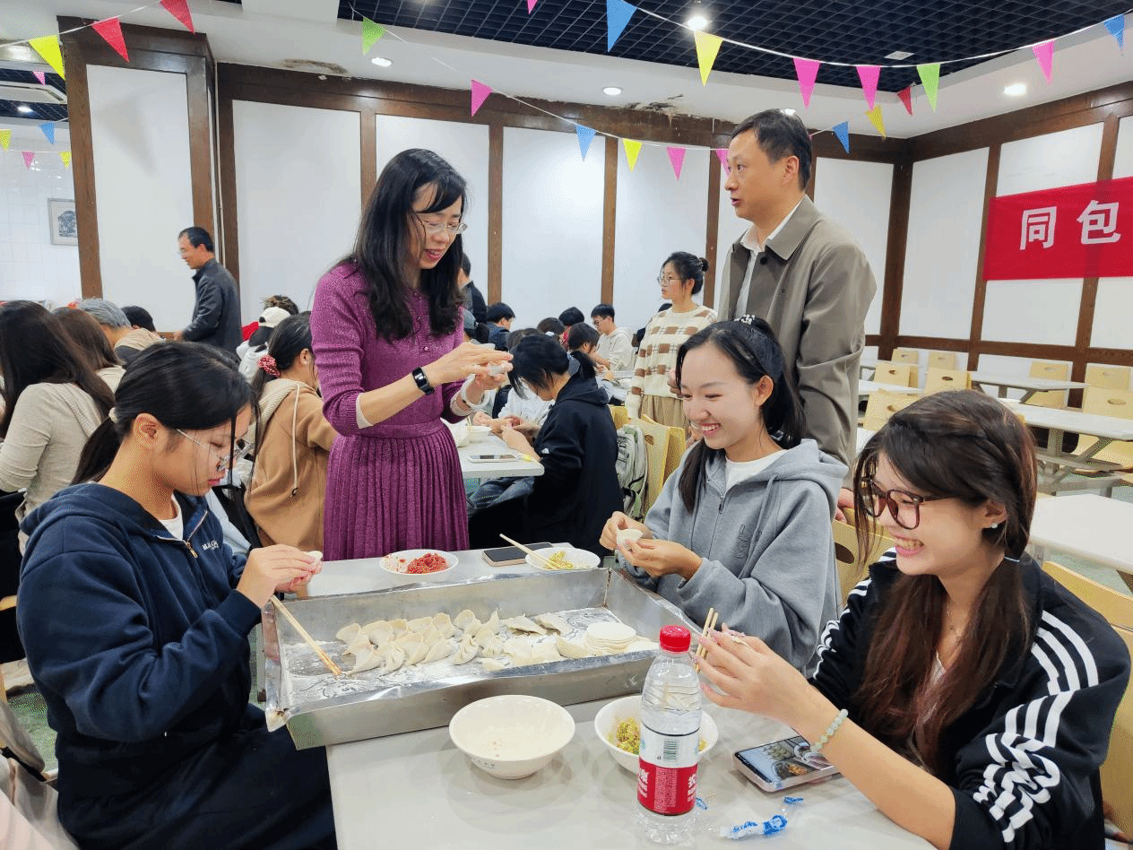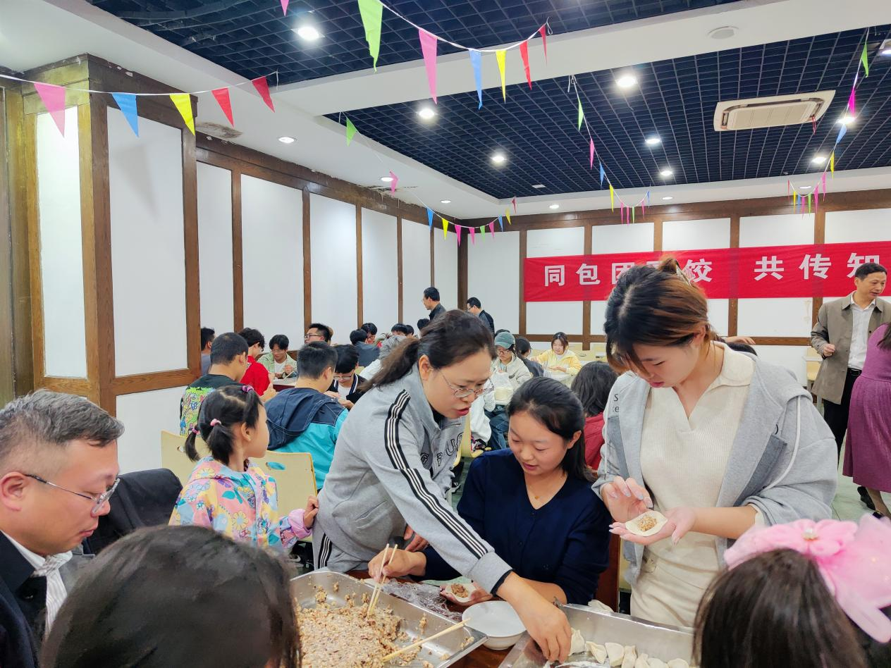 食堂内灯火明亮,全体师生围坐在桌旁,共同制作象征团圆的中华传统美食。活动中,老师们时不时地指导学生们包饺子的技巧,同学们时不时地展示亲手包的形状各异的饺子。在欢声笑语中传递着团圆的温暖,在和谐气氛中洋溢着幸福的滋味。