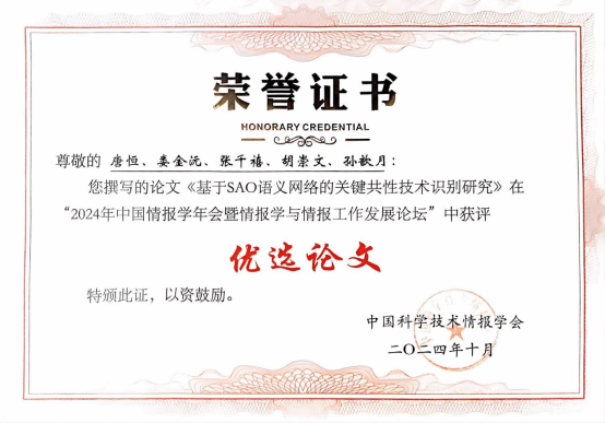 会上,娄金沅在情报学发展论坛、情报技术创新与实践分论坛上做了《基于SAO语义网络的关键共性技术识别研究》论文分享,并在“2024年中国情报学年会暨情报学与情报工作发展论坛”中获评优选论文。