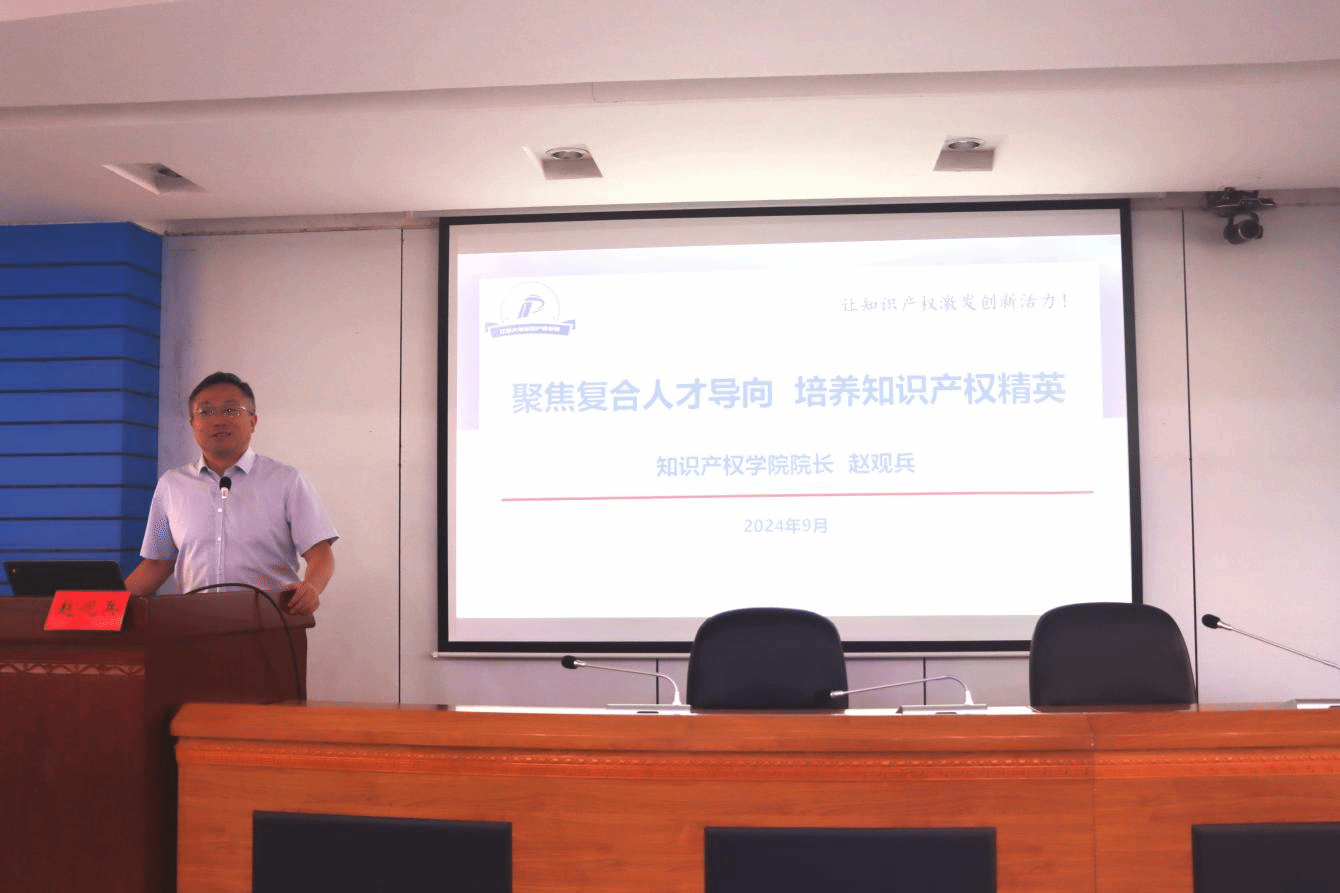 会上,院长赵观兵代表学院全体教职工欢迎2024级学子加入bv伟德国际1946大家庭。他以“聚焦复合人才导向 培养知识产权精英人才”为题,重点从知识产权专业人才培养背景、培养举措、培养成效等方面介绍了学院在人才培养方面的特色和取得的成果。他指出,学院自2023年招收第一批本科生以来,始终面向符合国家战略、行业急需的复合型人才培养需求,坚持“四个一工程”培养理念以及“目标导向”机制,分类指导、培养学生。一年来取得了显著成效,2023级29名学生中,有19人在各级各类课题立项、学科竞赛、文体活动中取得优异成绩,其中1人获得全国A类赛事一等奖,6人获得8项市级以上学科竞赛及课题,3人选拔进入学校菁英学院培养。他希望新生们及时从被动学习向主动学习转变,做好职业生涯规划,明确大学期间奋斗目标,最终实现个人梦想。