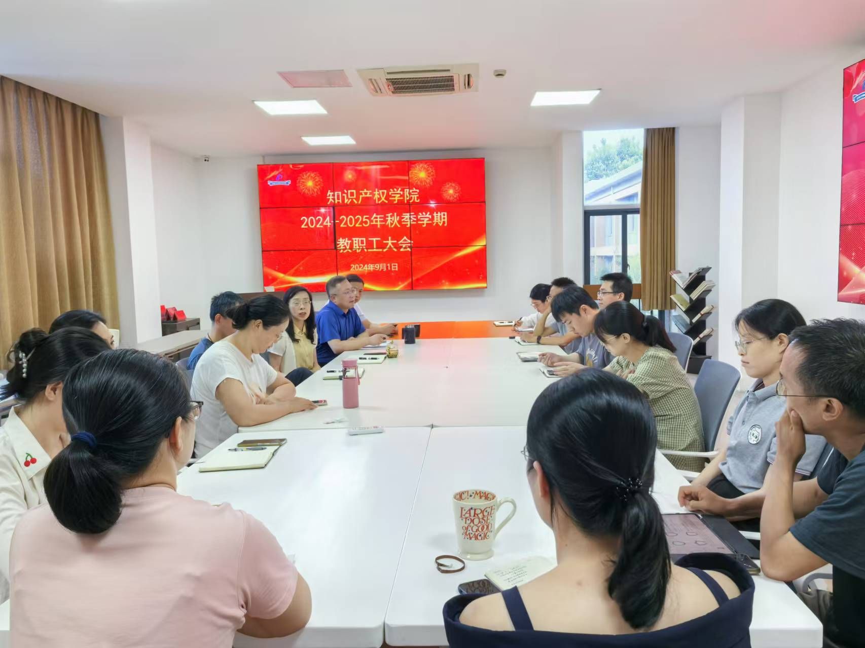 院长赵观兵首先传达了学校新学期全校干部教师大会精神,重点介绍了学校有关人事和考核制度改革的相关要点和具体要求,回顾了学院2024年上半年以及暑期重点工作完成情况,总结了学院在学科专业建设、人才培养、科研项目、师资引培等方面的工作进展,肯定了各项工作取得的良好成绩。他强调,知识产权专业特色学院建设和知识产权人才培养工作是学院特色发展的重中之重,事关学院核心竞争力和办学声誉,全体教职工要明确任务,对照时间节点全力推进各项工作。