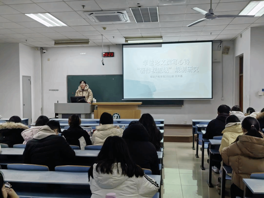 知产硕2501班的刘丰磊同学以《学位论文撰写心得:“著作权流氓”规制研究》为题,聚焦“著作权流氓”规制的学术主题,同时结合大二阶段的学习与实践特点,从选题贴合度、内容落地性等角度,介绍了适配低年级学生的学位论文撰写路径,让在场低年级同学们收获了符合自身阶段的写作技巧。