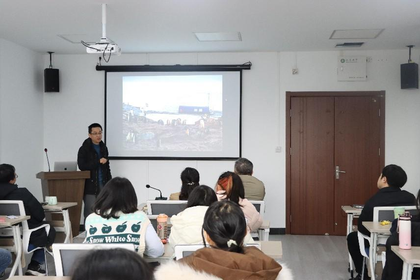 会上,王浩老师首先向师生们分享自己的南极之旅。通过分享旅途中的照片和视频,讲述自己南极之旅中的见闻和感悟,广大师生对南极的壮丽风景感到深深地震撼,并表示要在未来的学习生活中发扬探险精神,乘风破浪。
