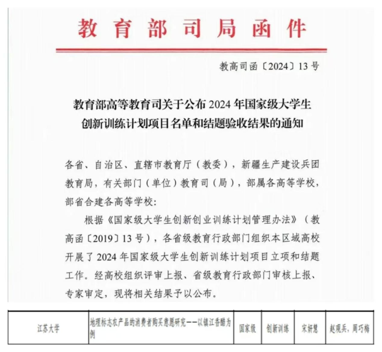 近日,根据教育部《关于公布2024年国家级大学生创新训练计划项目名单和结题验收结果的通知》,我院学子宋妍慧在赵观兵、周巧梅两位学业导师指导下,成功获批国家级项目立项。